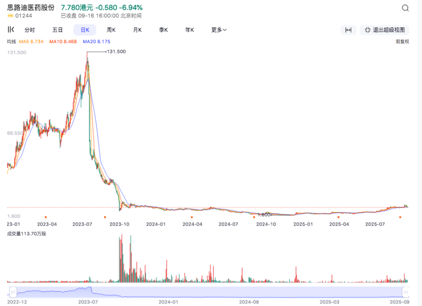 自9月8日调入港股通标的名单后,9月10日公司发布最新临床进展,南向资金的涌入进一步推高股价。9月12日暴涨77%,9月15日再涨115.58%,9月16日早盘一度冲至679.5港元。