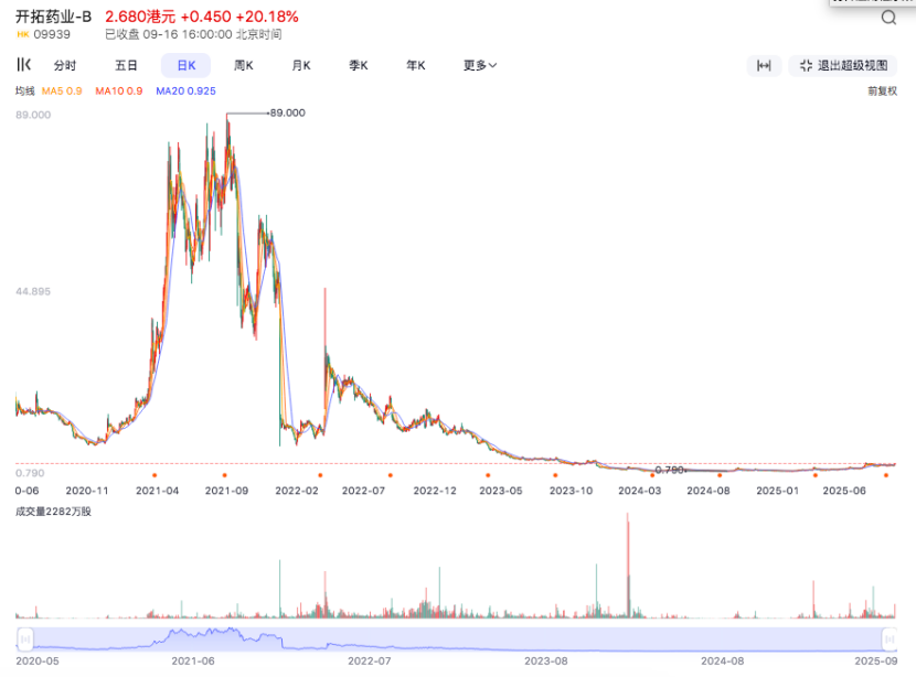 腾盛博药与开拓药业的股价“崩盘”来得更早一些。开拓药业曾在2021年中冲至最高位89港元,如今跌至2港元,跌幅高达97%