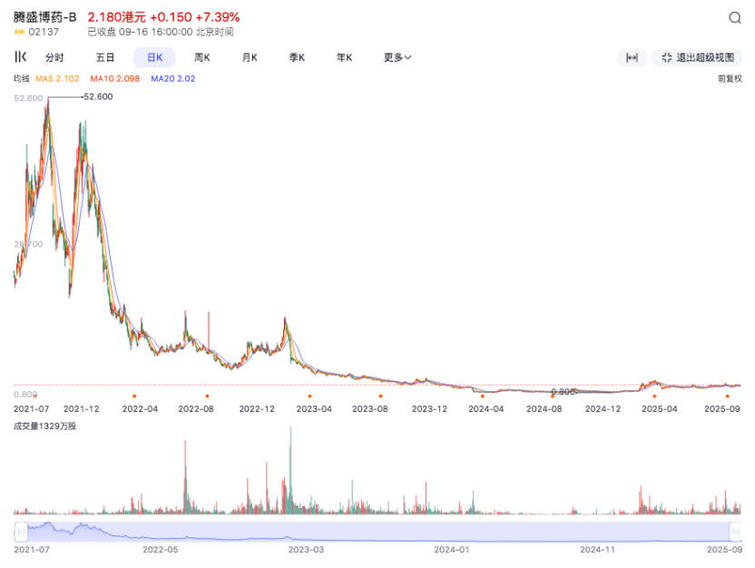 腾盛博药上市后曾最高至52.60港元,后一度跌至1.13港元,较发行价下跌94.92%。如今也在2港元/股附近徘徊。