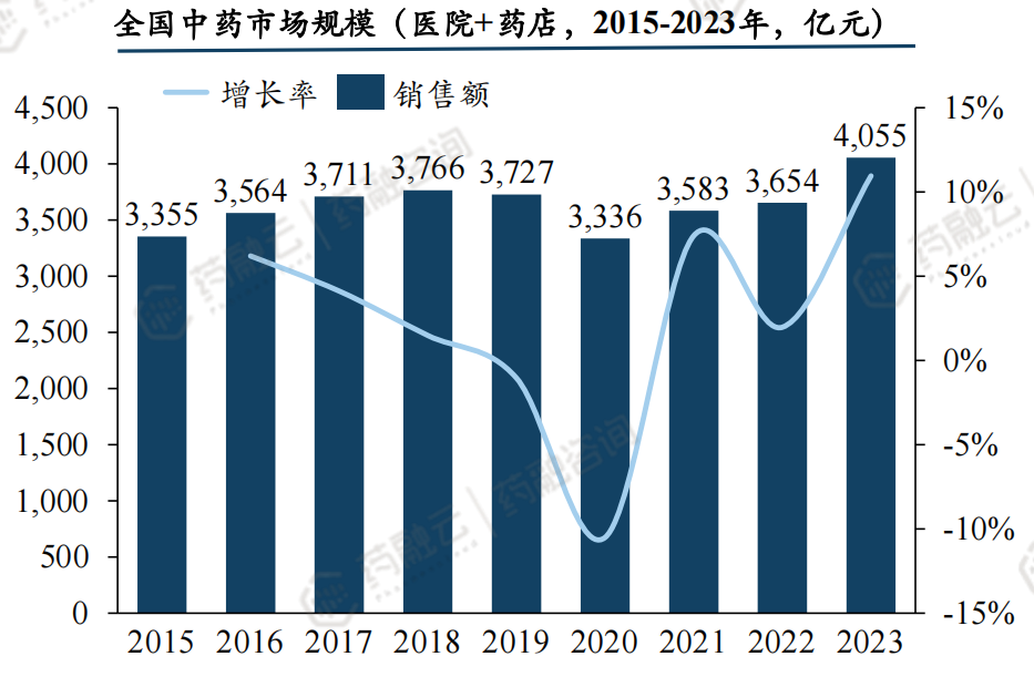 随着第二批全国中药饮片联采推进,这场覆盖千亿市场的价格治理行动正重塑行业格局。近年来中药市场稳定增长,据摩熵医药数据统计,2023 年中药约占整体医药市场规模的 23.7%,2015 - 2023 年我国医院 + 药店中药市场规模年复合增长率为 2.13%,2023 年全国中药市场规模超 4000 亿元,其中医院终端 2745 亿元,药店终端 1310 亿元。