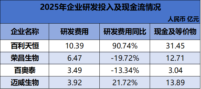 百奥泰与迈威生物则有所不同。百奥泰2025年研发费用3.49亿元,同比减少13.34%,现金及等价物仅3.04亿元,资金链压力显著。
