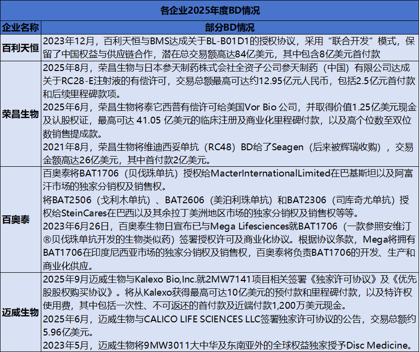 荣昌生物早期重磅BD在2021年将维迪西妥单抗以26亿美元授权给Seagen(现被辉瑞收购),2025年,公司再度活跃,先后将泰它西普和RC28-E分别授权给美国Vor Bio公司和日本参天制药,交易总额可达数十亿美元,也证明了其研发管线具备持续产出重磅产品的能力。
