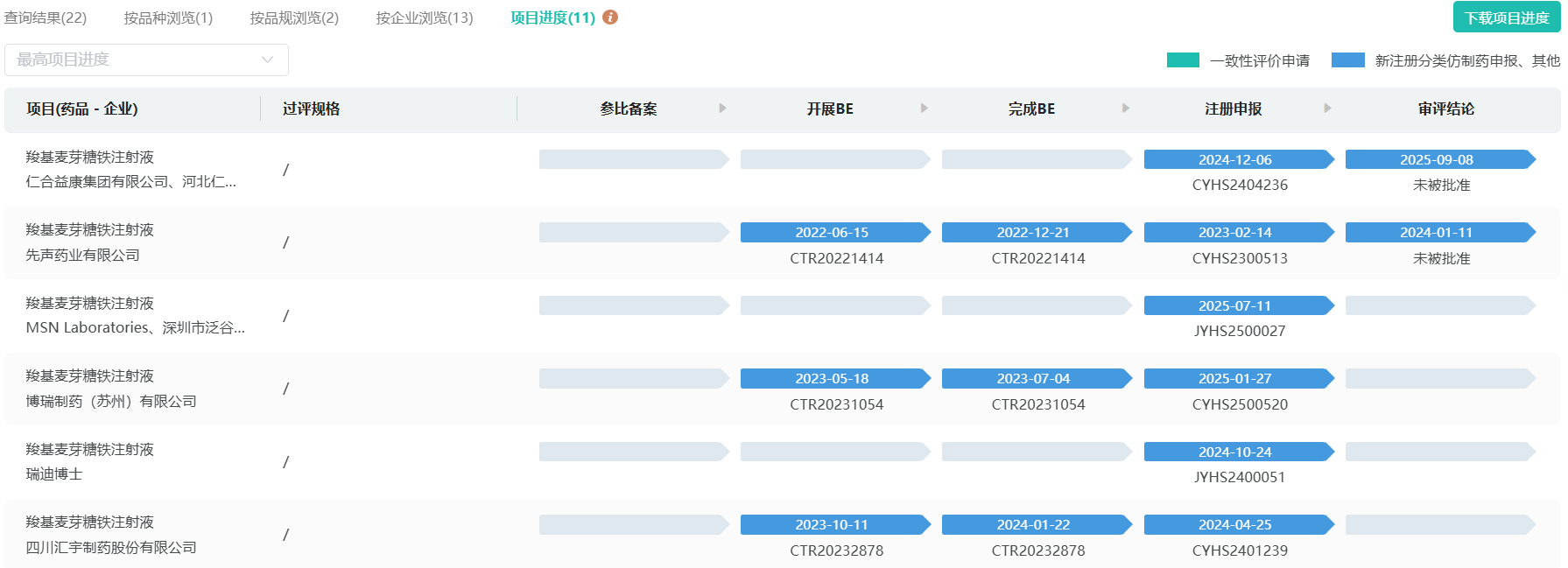 羧基麦芽糖铁,参比在2020年就已确立,2023年先声药业冲击该药品首仿,以失败告终,这两家企业均在首轮审评结束后收到不批准通知。当前,仅有四川汇宇进入补充资料审评阶段,有望成为该品种首仿的最终胜利者。