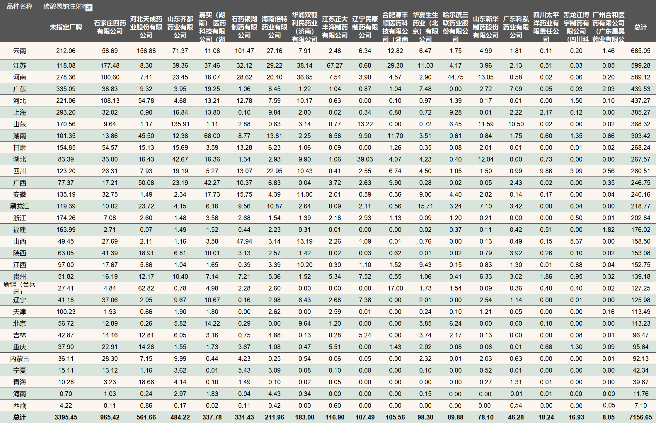 在本次集采众多药品中,碳酸氢钠注射液的报量情况备受关注。从整体数据看,全国31个省份对碳酸氢钠注射液的总报量为7156.65万单位。未指定厂牌的报量达3395.45万单位,占比高达47.45%,几乎占据总报量的半壁江山。