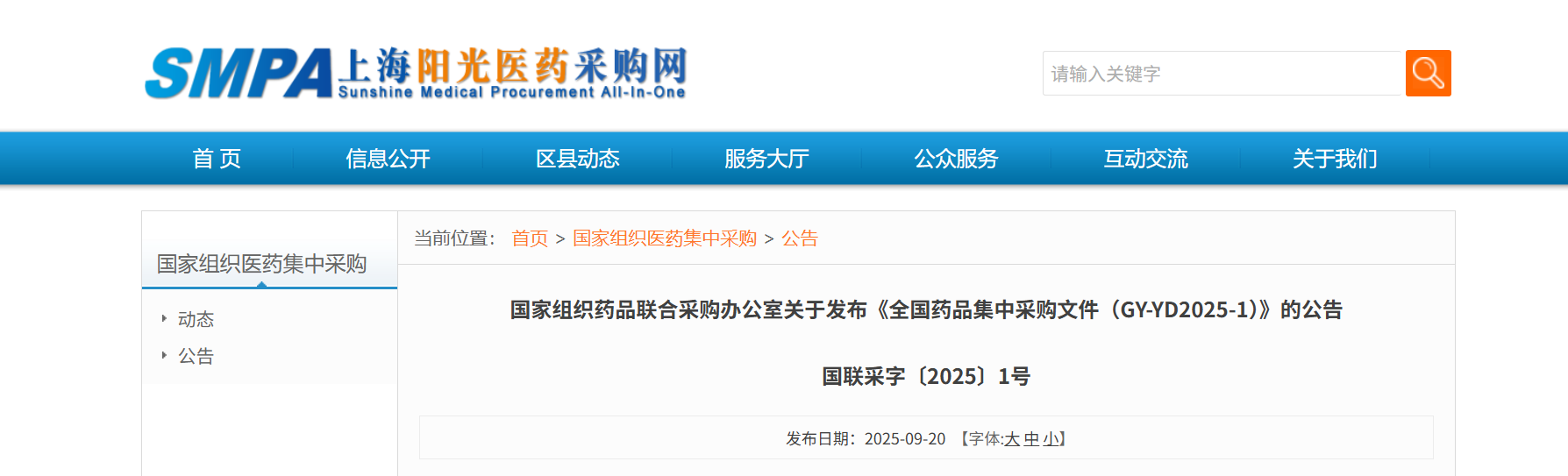 9月20日,上海阳光医药采购网发布消息,国家药品联采办正式公告《全国药品集中采购文件(GY - YD2025 - 1)》。参与集采的药品须于9月28日前取得国内有效注册批件,并在“国家医保服务平台”完成信息填报,开标仪式将于2025年10月21日在上海举行。国家医保局表示,此次集采方案制定修改充分遵循“稳临床、保质量、防围标、反内卷”原则。