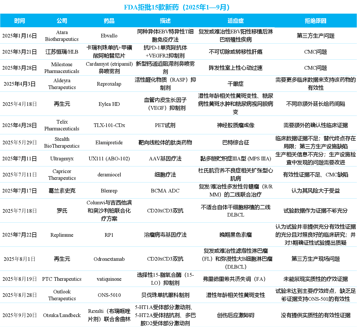 据不完全统计,2025年1-9月已有16款新药被FDA拒批,涉及到肿瘤、心脏疾病、呼吸系统疾病、眼科疾病和肾脏疾病等,被拒理由绝大多数集中于临床疗效和有效性证据不足问题上,此外CMC问题和第三方问题成为FDA拒绝批准的重要因素。小编将这些被拒批新药总结如下: