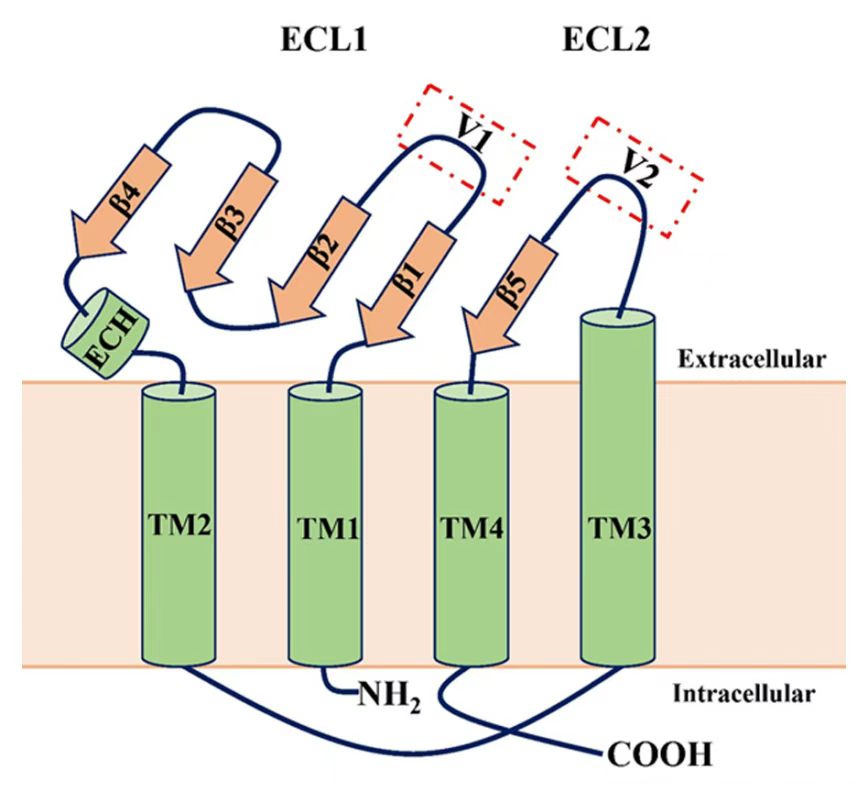 Claudins是四次跨膜蛋白,包括四个跨膜结构域(TM1-4)、细胞内N端和C末端以及两个细胞外环(ECL1和ECL2)。ECL1包含四条β链和一条胞外螺旋(ECH),ECL2包含一条β链和一个细胞表面暴露的部分跨膜结构域。