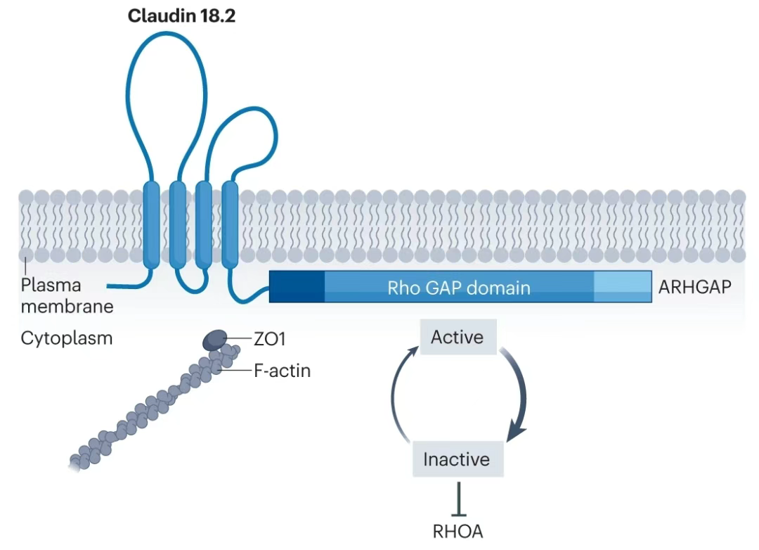 除了claudin 18.2表达的变化外,在胃癌患者中还检测到涉及CLDN18的融合。在3%的胃癌患者和10%的扩散型胃癌患者中检测到CLDN18-ARHGAP融合基因。这些融合破坏了连接复合体,可能是由于C末端结构域的缺失以及由此导致的与肌动蛋白调节蛋白的相互作用的缺失,再加上ARHGAP的Rho-GTPase结构域的异位定位,这种破坏导致转化蛋白RHOA的下游失活,可能导致恶性转化。然而,目前仍然没有确凿的证据表明claudin 18.2的表达与致癌作用之间存在直接联系。