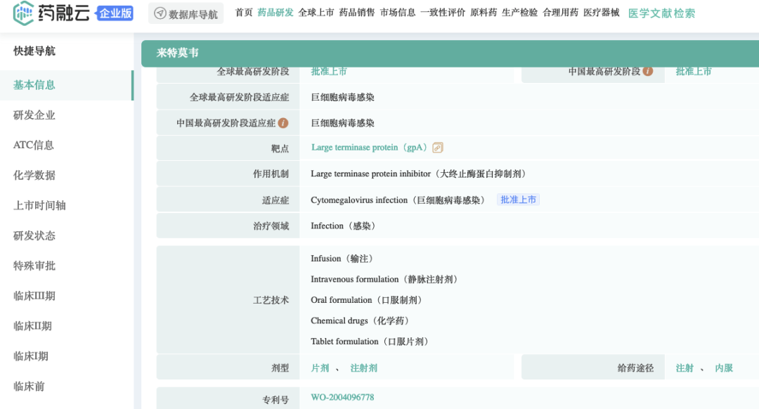 药融云数据,vip.pharnexcloud.com/?zmt-mhwz显示:2022年1月,默沙东旗下新型非核苷类巨细胞病毒(CMV)抑制剂来特莫韦片(普瑞明®)获得中国国家药品监督管理局(NMPA)批准,用于接受异基因造血干细胞移植(HSCT)的巨细胞病毒(CMV)血清学阳性的成人受者[R+]预防巨细胞病毒感染和巨细胞病毒病。