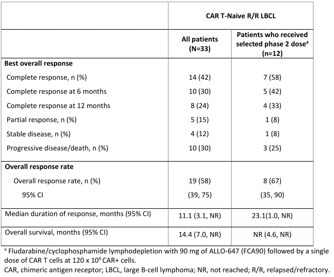 在复发/难治性大B细胞淋巴瘤(R/R LBCL)中,Allogene公司的cama-cell(曾用名ALLO-501A,靶向CD19)显示了颇具前景的疗效。其Ⅰ期ALPHA2研究显示,经治患者中的客观缓解率(ORR)为58%,完全缓解率(CR)达42%。尤为重要的是,获得完全缓解的患者展现了持久的疗效,中位缓解持续时间(DOR)达到23.1个月。
