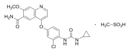 瑞戈非尼于2012年获得FDA批准,可用于胃肠道间质肿瘤、直肠癌和肝细胞癌,肝细胞癌方面,本品获批的用法是既往接受过索拉非尼治疗的HCC治疗。本品是一种多靶点抑制剂,可以抑制RET, VEGFR1/2/3, KIT, PDGFR α/β, FGFR1/2, TIE2, DDR2, TrkA, Eph2A, RAF-1, BRAF, BRAF V600E, SAPK2, PTK5, Abl和CSF1R等多个靶点。在一项多中心的临床试验中,入组患者均为Child-Pugh分级A级、巴塞罗那分期(Barcelona Clinic Liver Cancer)分别为B期或C期、既往经历过索拉非尼治疗后进展的HCC患者(平均索拉非尼治疗时间为7.8个月)。受试者按2:1分组,分别接受本品或安慰剂治疗,结果显示mOS分别为10.6个月 vs 7.8个月,mPFS分别为3.1个月 vs 1.5个月,客观缓解率(ORR)分别为11% vs 4%。