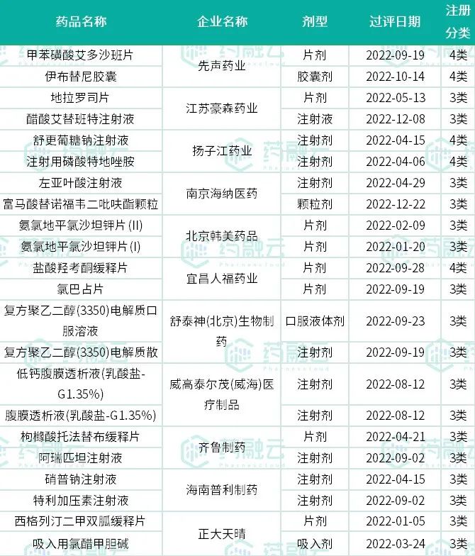 先声药业、江苏豪森、扬子江、南京海纳医药、北京韩美药品、宜昌人福药业、舒泰神(北京)生物制品、威高泰尔茂(威海)医疗制品、齐鲁制药、海南普利制药和中国生物均分别有2款首仿药获批上市,分别为甲苯磺酸艾多沙班片、伊布替尼胶囊;地拉罗司片、醋酸艾替班特注射液;舒更葡糖钠注射液、注射用磷酸特地唑胺;左亚叶酸注射液、富马酸替诺福韦二吡呋酯颗粒;氨氯地平氯沙坦钾片(II)、氨氯地平氯沙坦钾片(I);盐酸羟考酮缓释片、氯巴占片;复方聚乙二醇(3350)电解质口服溶液、复方聚乙二醇(3350)电解质散;低钙腹膜透析液(乳酸盐-G1.35%)、腹膜透析液(乳酸盐-G1.35%);枸橼酸托法替布缓释片、阿瑞匹坦注射液;硝普钠注射液、特利加压素注射液;西格列汀二甲双胍缓释片、吸入用氯醋甲胆碱。