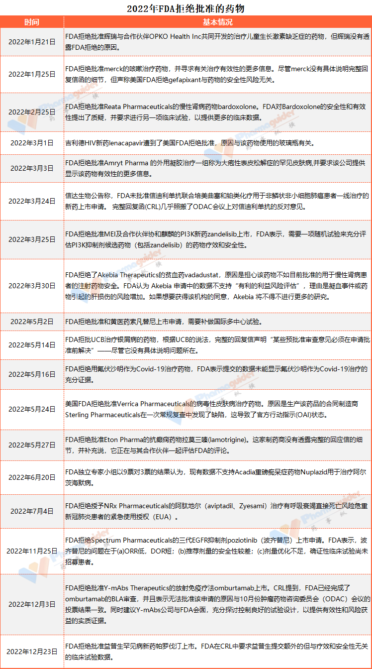 FDA手握“生杀大权”,不仅影响着大药企,还决定着众多Biotech的生死,也牵动着国内药企们的心。据不完全统计,2022年FDA拒绝批准了18款药物,涉及治疗新冠药物、罕见病、抗体药、儿童生长激素、阿尔茨海默症、放射免疫疗法等各个方面,看看原因何在?