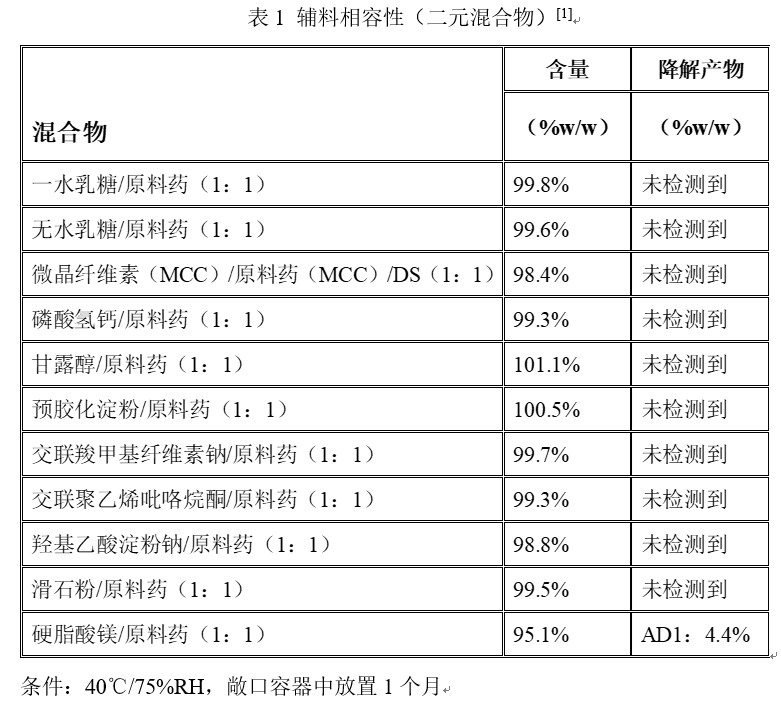 注意:原辅料相容性实验结果提示原料药和辅料不相容并不代表该辅料一定不能用。实验结果仅是为制剂研究者提示某些辅料和原料药存在相容性风险,至于辅料能不能用需要综合考虑。