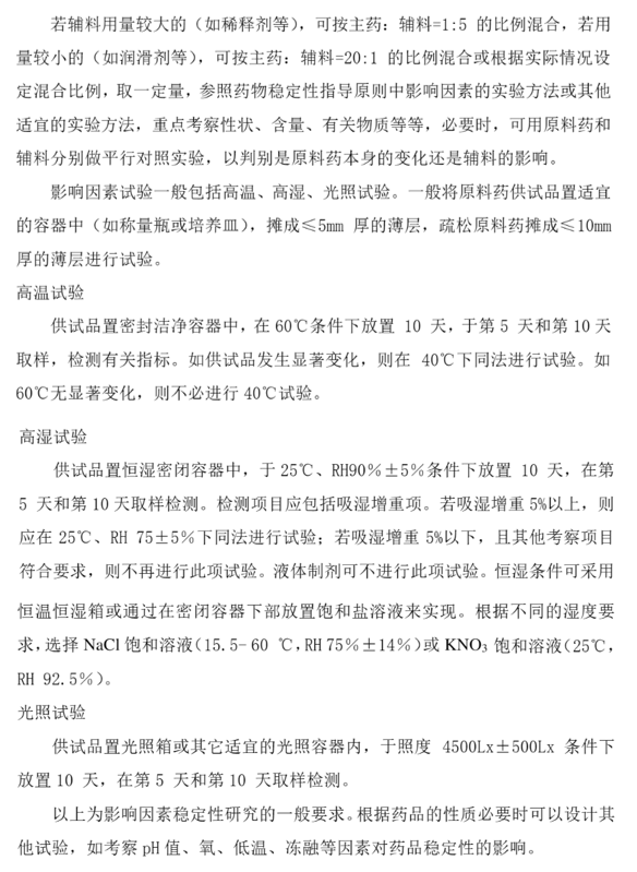 原辅料相容性实验条件设计可参考以上四种指导原则或2020版中国药典9001《原料药物与制剂稳定性试验指导原则》。虽然实验条件多是在高温、高湿和强光条件下,但具体药物具体分析,并不需要三种条件都做。例如,在已知原料药光不稳定的基础上,要取消强光条件,并对样品避光处理。主辅料相容性实验设计的目的是判断原料药和辅料是否会发生化学反应,高温、高湿和强光条件仅是来加速化学反应发生的速度。