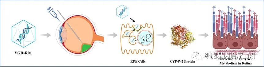 VGR-R01通过视网膜下腔注射给药后,AAV衣壳蛋白介导RPE细胞的转导,将VGR-R01基因表达盒递送至细胞核。VGR-R01表达盒以游离DNA的形式存在,在RPE细胞表达CYP4V2蛋白,以重建细胞的脂肪酸羟化酶活性。