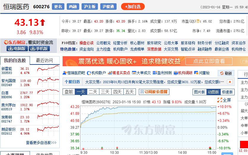 1月16日,生物医药股迎来强势上涨,迈瑞医疗、药明康德、智飞生物、药康生物等多股上涨,截至下午14时,上百支医药概念股全线飘红,其中,有着“创新药一哥”之称的恒瑞医药(600276)开盘即涨,上午10点,恒瑞医药股价涨停,收获了新年来首个涨停板,目前市值2751亿。
