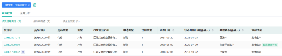 2023年1月4日,药监局官网显示,艾迪药业的1类创新药艾诺米替片(商品名:复邦德)获批上市。艾诺米替本品为艾诺韦林、拉米夫定和富马酸替诺福韦二吡呋酯组成的复方制剂,用于治疗成人HIV-1感染初治患者。这是2023年第一款获得国家药监局批准上市的1类新药,同时也是国产首个三合一(三种成分形成的单片给药)艾滋病新药。据药融云数据库,中国药品审评情况如下: