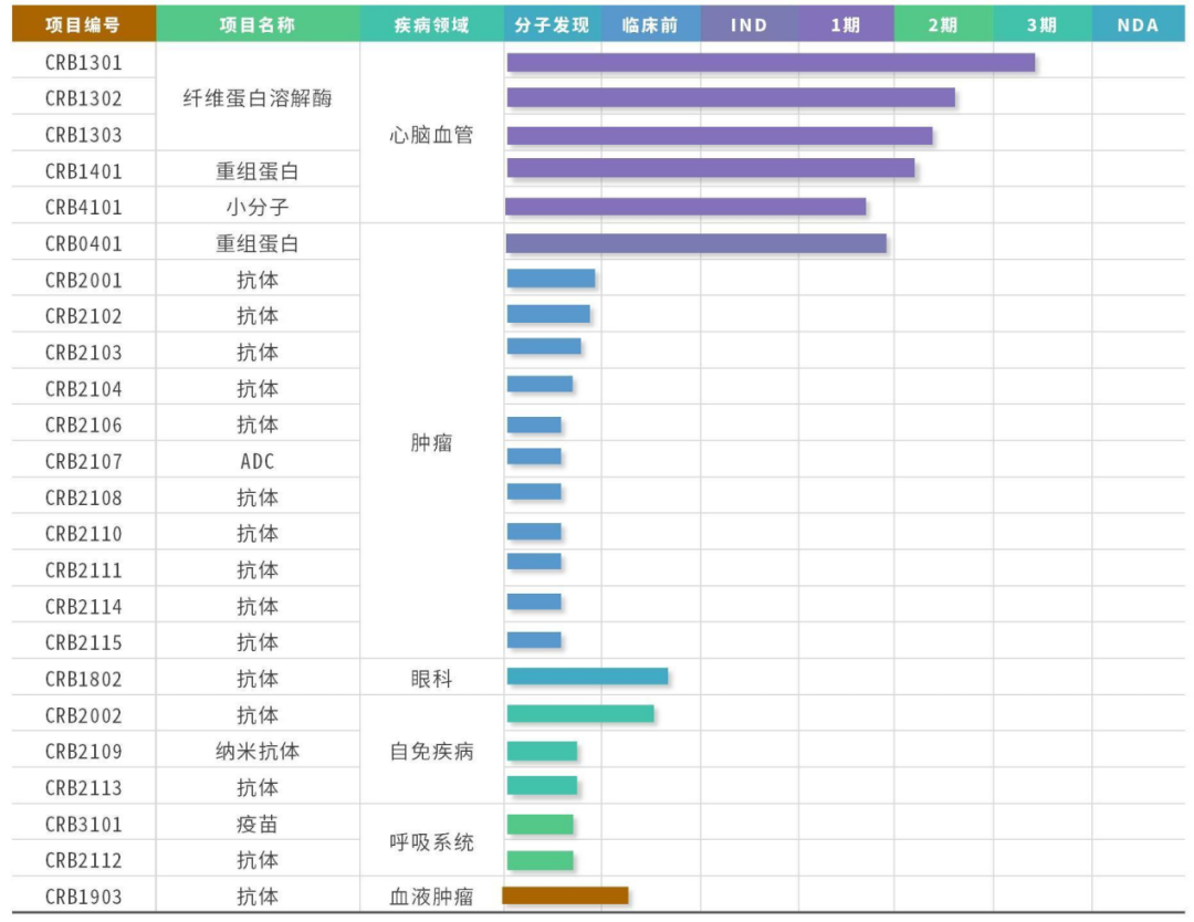 2023年1月10日,华润生物宣布完成6亿元的B轮融资,由国调基金领投,混改基金、建信股权、粤科基金、无锡国联跟投(《13起生物医药投融资事件!华润生物完成6亿B轮融资,加速新药研发》)。本轮融资将主要用于加速创新生物药的研究、临床试验阶段研发管线的推进以及外部项目的引进等。据公司官网, 目前在研品种共24个,其中6个处于临床研究阶段。公司持续专注重组蛋白、抗体以及创新生物技术的研发,提升核心竞争力。