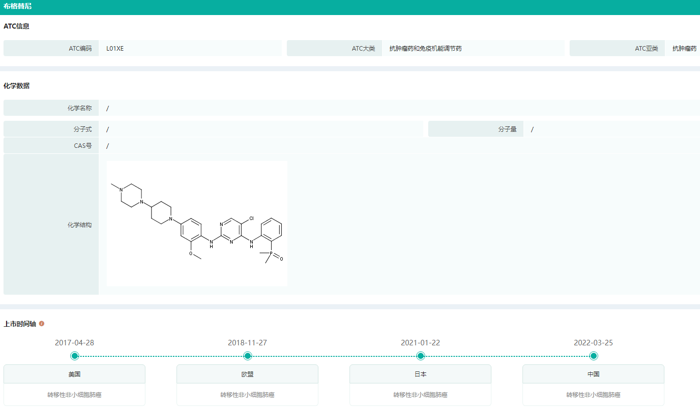 布格替尼(Brigatinib,AP26113)是由Ariad公司研发的ALK/ROS1/EGFR抑制剂,于2017年4月28日被美国FDA批准用于经克唑替尼治疗后病情恶化或对克唑替尼不耐受的ALK阳性转移性非小细胞肺癌患者的治疗。