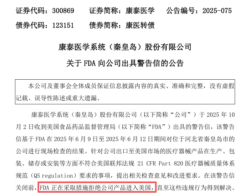 10月10日盘后,康泰医学公告称,公司于2025年10月2日收到FDA出具的警告信,FDA正在采取措施拒绝公司产品进入美国,直至违规行为得到解决。