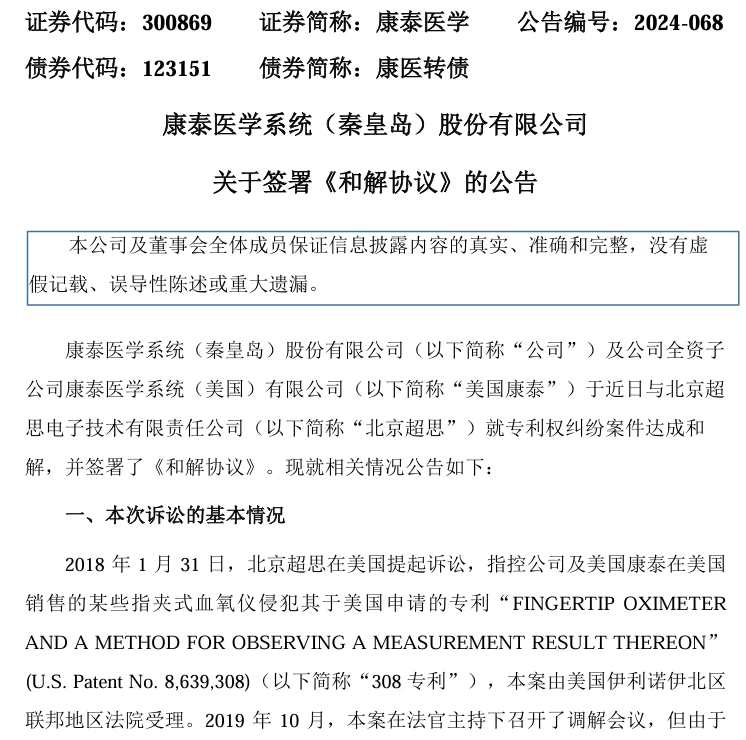 2024 年10月23日,美国专利商标局发文认定北京超思的308专利6项权利 有效。 鉴于公司及美国康泰2018年后已停止在美国境内制造、进口、使用、提供销售或销售案涉专利争议产品,为节约诉讼成本,减少长周期诉讼造成的诉累,集中精力发展美国康泰业务,康泰医学及美国康泰与北京超思达成和解。