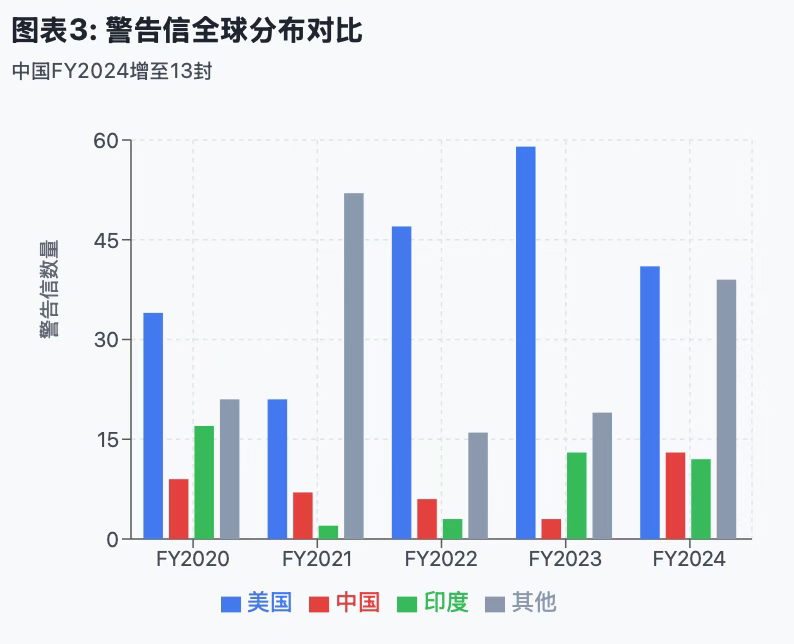 而FDA对中国抽检量,常年位居除美国外的全球首位,且抽检频率在近两年激增,警告信数量也显著增加。目前,中国在 FDA 注册的制造商约有 4500 家,每年的抽查概率在 2% - 3% 之间。这一监管趋势,值得诸多厂商警醒。