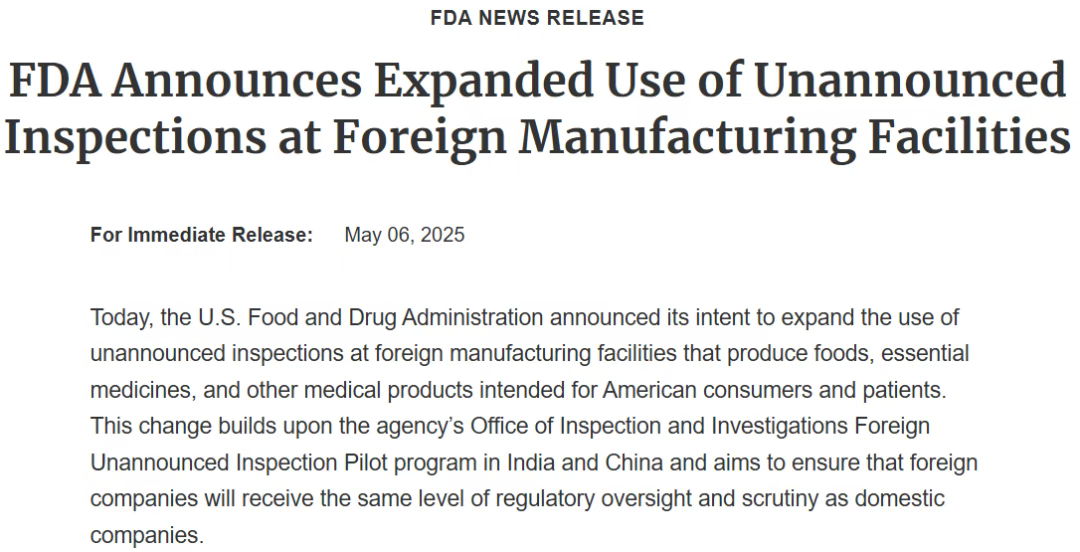 FDA 专员表示:“长期以来,外国公司一直享有双重标准——在设施检查前接到提前通知,而美国制造商则在没有此类警告的情况下遵守严格的标准。这种情况到今天就结束了。”