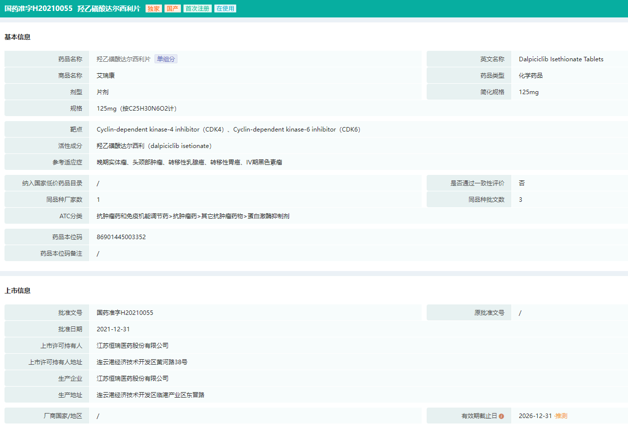 羟乙磺酸达尔西利片生产批文信息(部分)