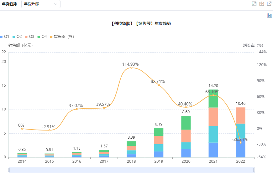 据药融云全国医院销售数据库显示,利拉鲁肽在中国医院端的市场规模呈快速上升趋势,2021年医院端销售额达到14.2亿元,在糖尿病领域的市占率多年稳居第一。司美格鲁肽由于在国内上市时间稍短,2021年医院端的市场规模仅为445.87万元,但在纳入医保后2022年上半年的销售量飙升至3.16亿元。