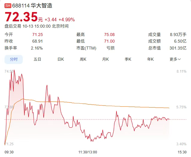 该交易也给二级市场带来了积极影响。10月13日,华大智造股价呈现出上涨态势,表现活跃:当日以71.25元开盘,盘中股价一度冲高至75.08元,相较于前一交易日68.91元的收盘价,盘中最高涨幅约达8.95%。当天华大智造最终以72.35元收盘,涨幅4.99%,公司总市值超300亿元。