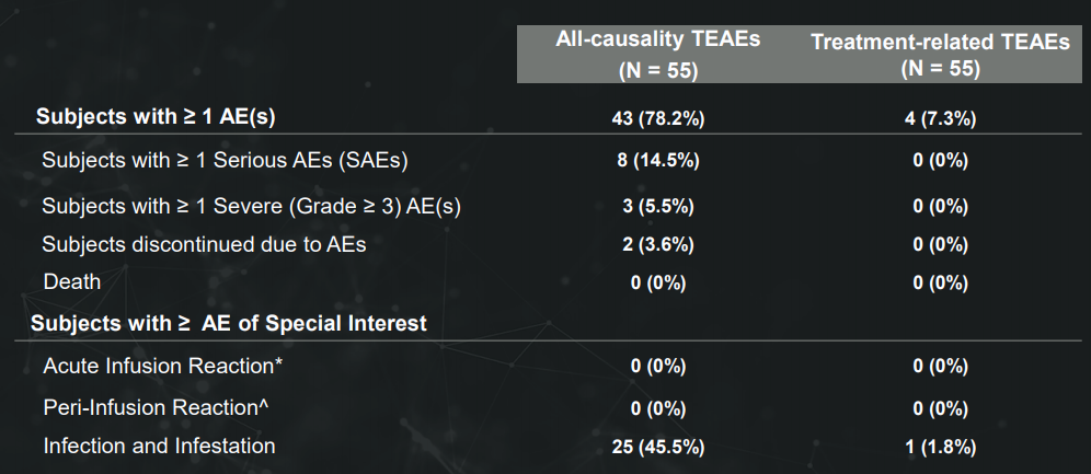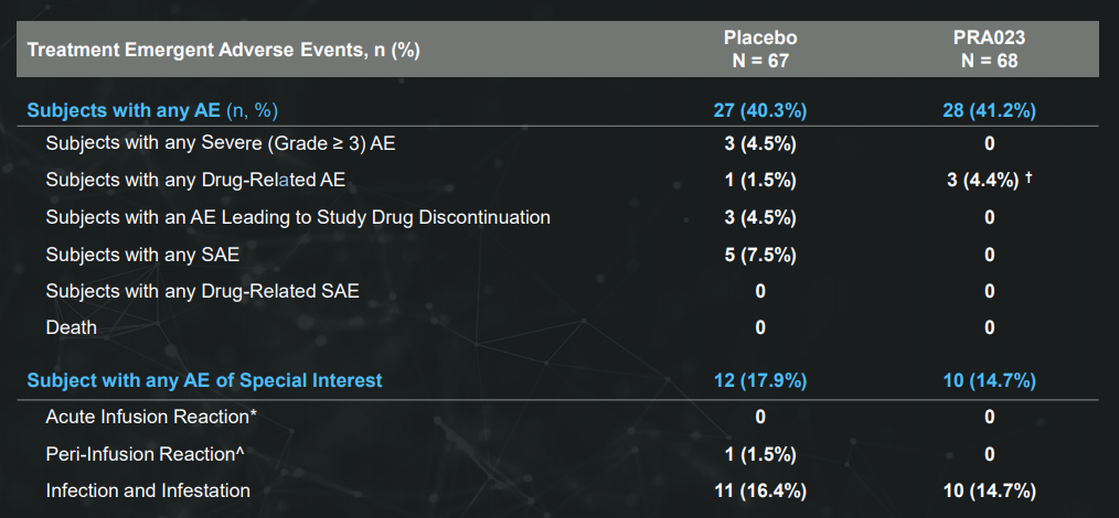 安全性上,PRA023组没有治疗产生的严重不良事件(SAE)、AE、严重AE、机会性感染或输液反应的报告。与安慰剂相比,PRA023组唯一发生在两个以上患者身上且频率较高的AE是COVID-19(分别为5/68 [7.4%] 和3/67 [4.5%])。