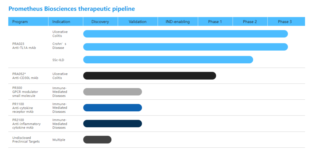 Prometheus拥有1个精准治疗药物平台,Prometheus360™,该平台包括了1个胃肠道(GI)生物信息学数据库,用于识别新的治疗靶标并开发候选药物,该数据库是世界上最大的GI数据库之一。同时,公司还在开发伴随诊断测试,旨在识别更可能对治疗药物产生反应的患者。