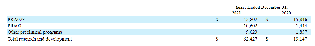 主要是由于:(1)PRA023的1a期临床试验和启动PRA023的全球2期临床试验相关的临床试验费用增加了1340万美元;(2)与支持PRA023的临床试验和PR600的pre-IND活动的合同制造活动有关的费用增加了930万美元;(3)与人员费用有关的支出增加了680万美元,以支持更多的开发和临床试验活动;(4)与Enroll360平台有关的支出增加了220万美元,与PRA023在SSc-ILD中的2期临床试验的启动活动有关的支出增加了210万美元;(5)其他临床前开发项目和两个主要目标PRA023和PR600有关的持续开发活动的支出。