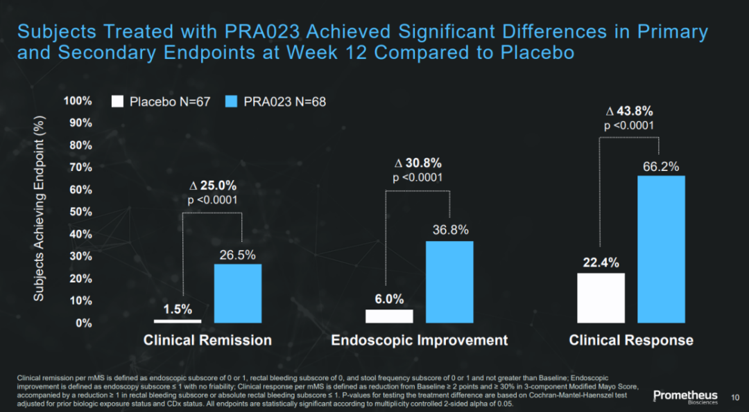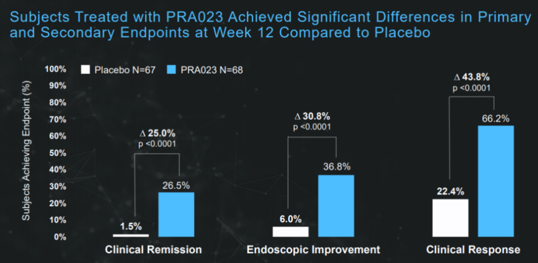 在治疗中重度溃疡性结肠炎的随机双盲Ⅱ期临床试验中,PRA023达到主要终点。12周治疗后,PRA023组中26.5%的患者达到临床缓解的主要终点,对照组这一数值为1.5%(p<0.0001)。PRA023组中36.8%的患者达到内窥镜改善的次要终点,安慰剂组的数值为6.0%(p<0.0001)。