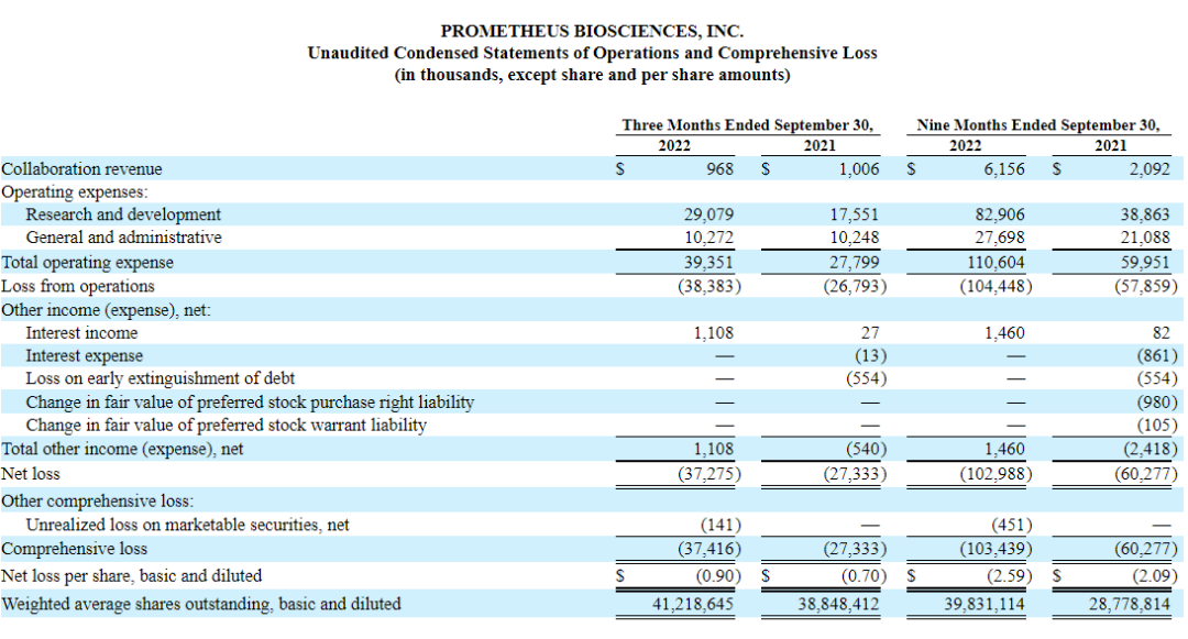 2022年11月09日,Prometheus公告称,2022财年前三季度收入615.6万美元,去年同期收入为209.2万美元,同比增长194.26%;2022财年前三季度净亏损1.03亿美元,去年同期净亏损为6027.7万美元;基本每股收益为-2.59美元,去年同期为-2.09美元。