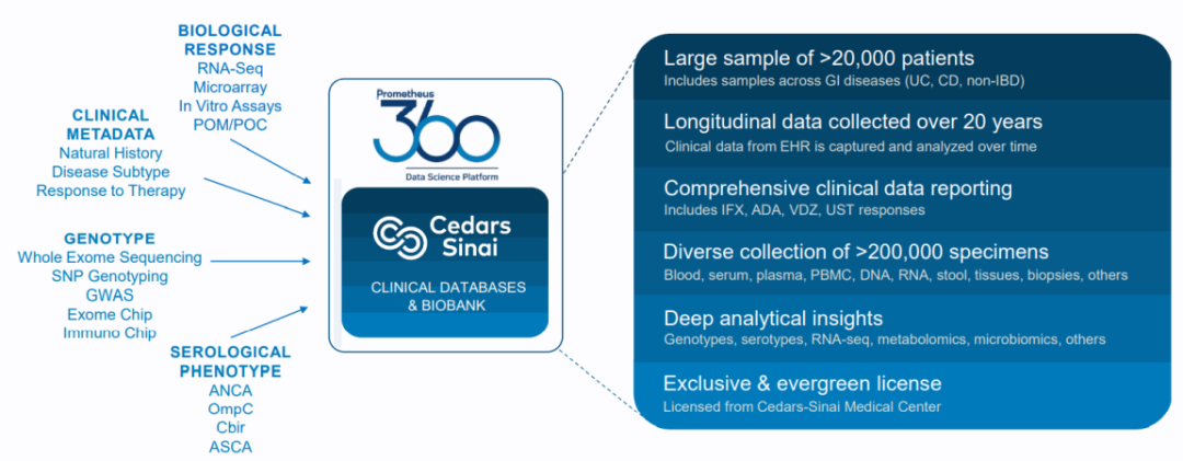 Prometheus360™平台包括临床数据库和相关的生物库,是全球最大的IBD和其他胃肠道疾病患者生物标本数据库之一。该数据库和生物库是从Cedars-Sinai Medical Center(Cedars-Sinai)独家授权获得,数据库中拥有超过20万个临床样本,来源于20年间收集的约2万例患者数据。数据包括了患者的电子医疗记录、影像信息、临床生化、病理记录和血清学数据。生物库中的患者样本,则包括组织活检(来自内镜检查或手术)、血清/血浆、DNA、RNA、外周血单核细胞(PBMC)、固有层单核细胞(LPMC)、粪便和肠系膜脂肪组织。