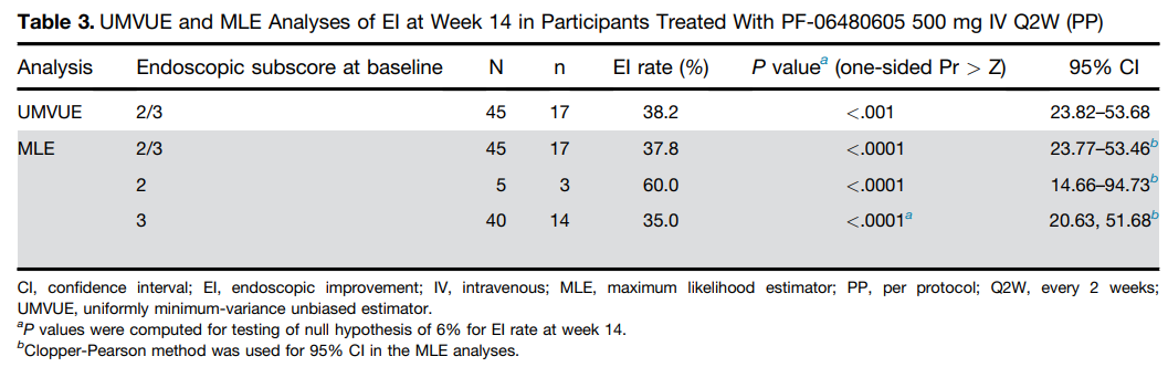RVT-3101是一种针对TL1A的全人类单克隆抗体,目前正处于溃疡性结肠炎(UC)的大型全球2b期临床中。此前公布的2a期试验中,最常见的AE是UC疾病加重和关节痛(各6人),有4个严重的AEs,没有死亡。第14周,内窥镜改善率(EI)为38.2%。