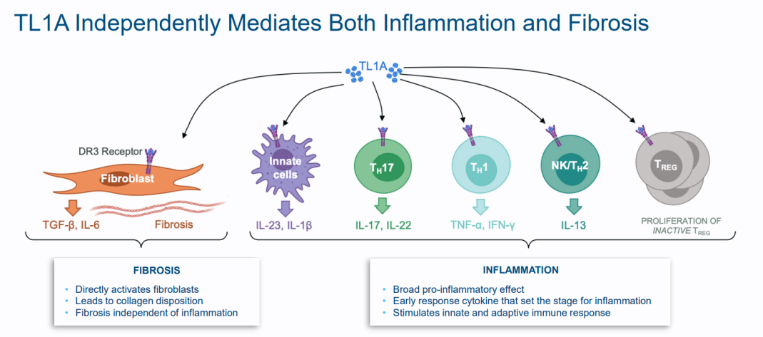 TL1A是Prometheus Biosciences创始人发现的一个创新炎症性肠病靶点。TNF配体相关分子1A(TL1A)属TNF超家族成员,能够介导炎症和纤维化,是肠道炎症的关键介质。它在介导炎症和纤维化方面具有多重作用,并且与多种免疫和纤维化疾病相关。PRA023可以与可溶性或细胞膜结合的TL1A特异性结合,具有显著改变那些TL1A表达水平升高的IBD患者病情的潜力。