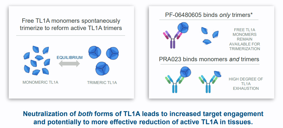 PRA023与辉瑞TL1A药物不同之处在于,PRA023能有效结合和中和TL1A的活性三聚体形式和非活性单体形式,以实现更稳定的靶标结合。