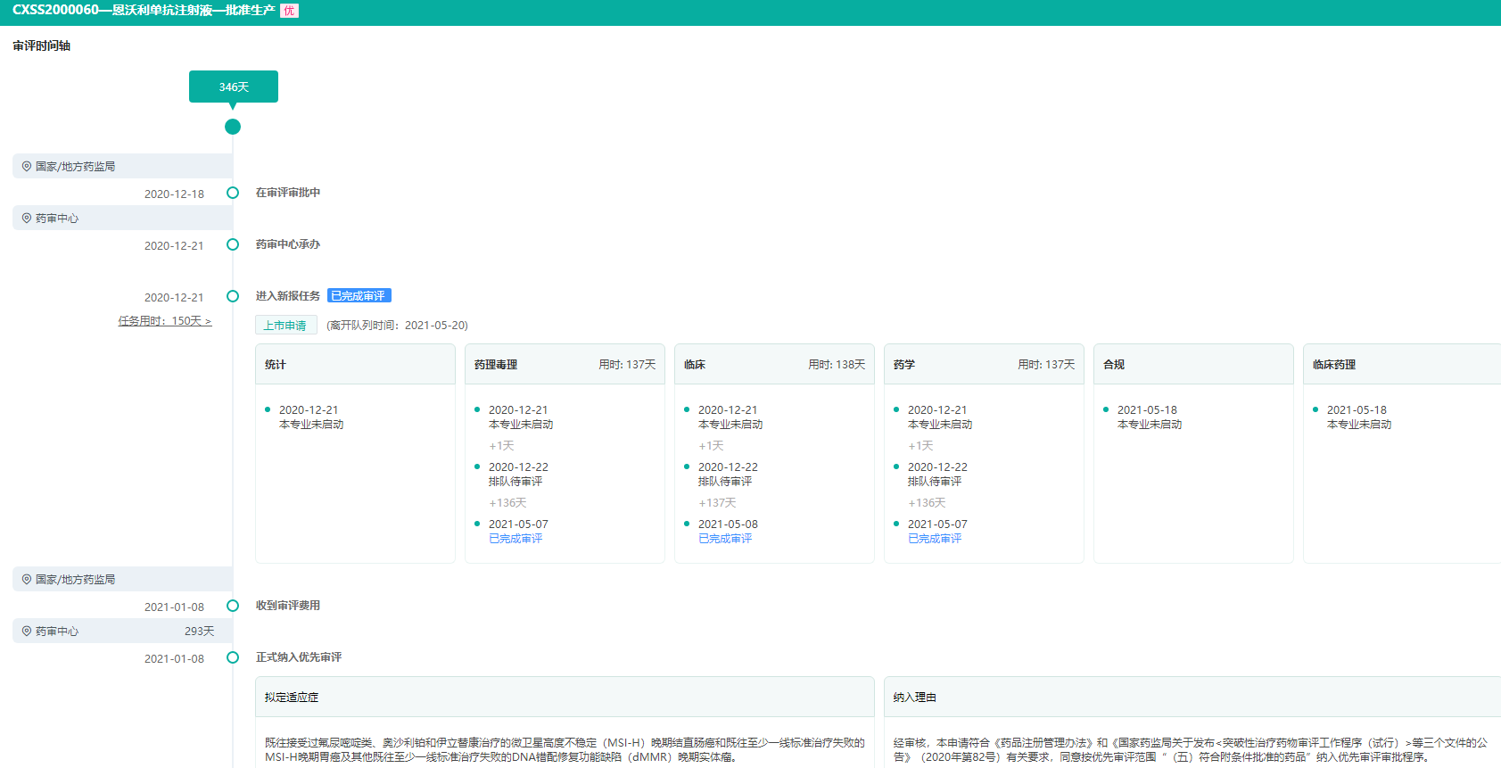 恩沃利单抗注射液(KN035)是全球首个皮下注射的PD-L1抑制剂,药融云中国药品审评数据库显示,恩沃利单抗于2021年11月26日获NMPA批准上市,审评总用时346天,适用于不可切除或转移性微卫星高度不稳定(MSI-H)或错配修复基因缺陷型(dMMR)的成人晚期实体瘤患者:既往经过氟尿嘧啶类、奥沙利铂和伊立替康治疗后出现疾病进展的晚期结直肠癌患者;既往治疗后出现疾病进展且无满意替代治疗方案的其他晚期实体瘤患者。