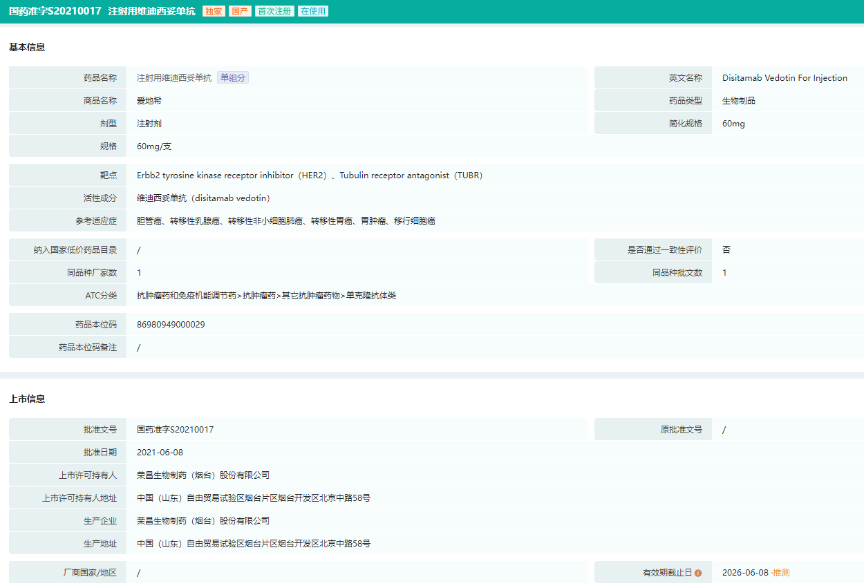 维迪西妥单抗(Disitamab Vedotin,商品名:爱地希)为荣昌生物制药自主研发的创新抗体偶联药物(ADC),适用于至少接受过2种系统化疗的HER2过表达局部晚期或转移性胃癌(包括胃食管结合部腺癌)患者的治疗。