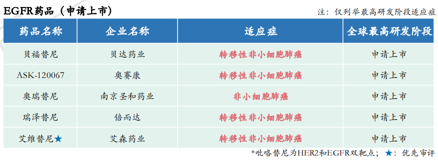 已批准上市的EGFR代表药品,有恒瑞医药的吡咯替尼、豪森药业的阿美替尼、艾力斯的伏美替尼。