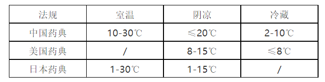 我们知道,产品的储存温湿度可以根据稳定性实验数据获得,那么生产环境的温湿度如何控制呢?为了控制成本,原料药生产企业一般控制温湿度也只是控制产品最终成型的步骤(即内包装前一步),要求产品暴露的环境尽量和产品的储存温湿度相一致,比如产品贮存温度要求是阴凉,该区域的环境就按照阴凉的标准设置,同时也要考虑操作人员的舒适性,比如在冬季,环境温度较低时,甚至达到零下,如果不采取温控措施的话,操作员工必定会感到不舒适,就不能保证产品持续稳定的生产。这里面还有一个问题,就是不同国家对温度的定义不同,企业可以根据产品销售市场的不同,选择合适的控制温度,以下列举了常见国家对常见温度的定义: