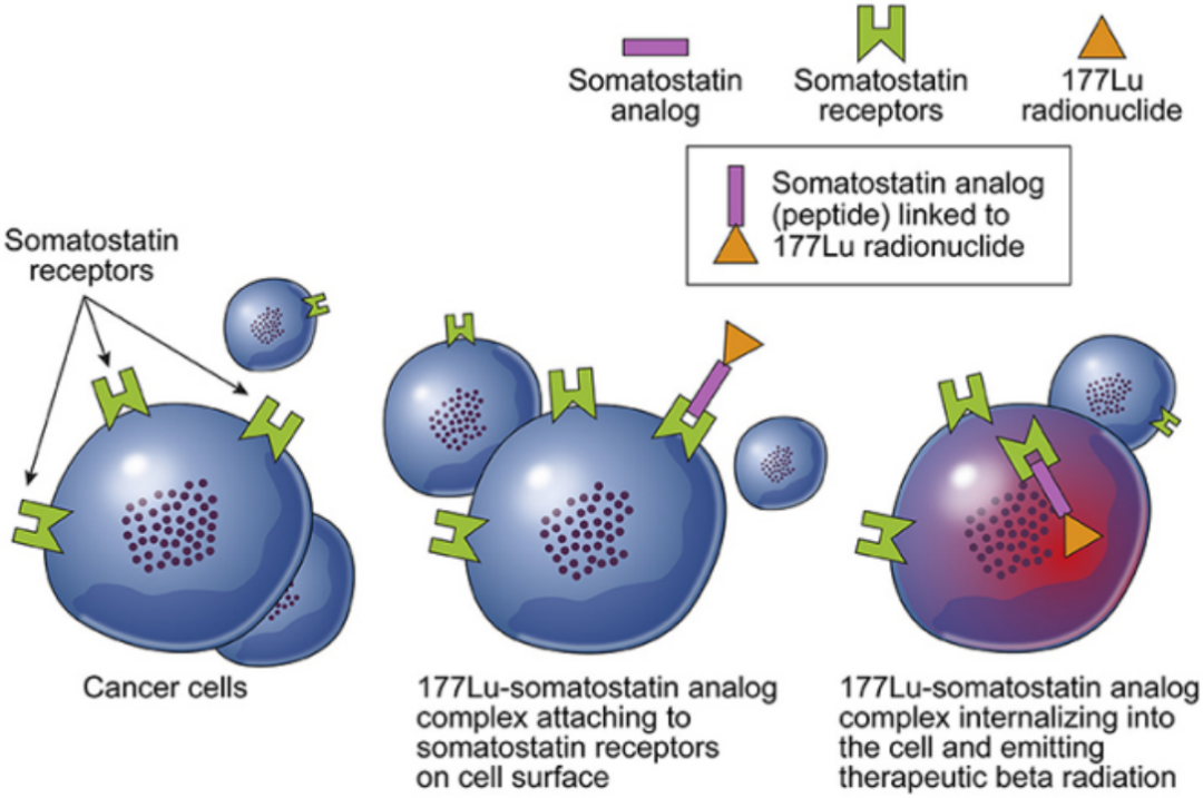 镥[177Lu]氧奥曲肽注射液(lutetium Lu 177 dotatate)此前获批用于不可切除或转移性、进展性、分化良好(G1及 G2)、生长抑素受体阳性的成人胃肠胰神经内分泌瘤(GEP-NETs)的治疗。这是FDA批准的第一个放射性多肽靶向肿瘤治疗药物(Pepide Receptor Radionuclide Therapy,PRRT)。LUTATHERA分子内的奥曲肽可以与肿瘤细胞表面的生长抑素受体结合,将放射性177Lu运送到细胞内部,通过发射β射线对肿瘤细胞造成损伤。