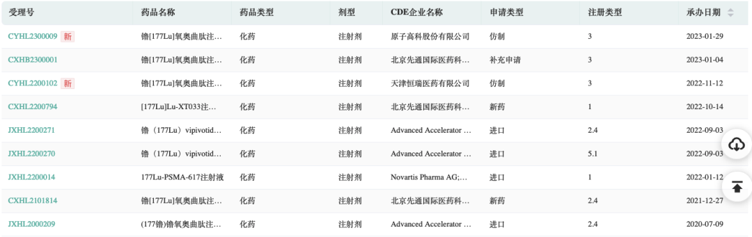药融云数据库显示:此外,中国工程物理研究院核物理与化学研究所/先通医药合作开发的一款核药——镥[177Lu]氧奥曲肽注射液,目前已进入了关键3期临床阶段,组长单位中国人民解放军总医院第一医学中心。原子高科股份有限公司的本品申报临床试验,并获得CDE受理公示。