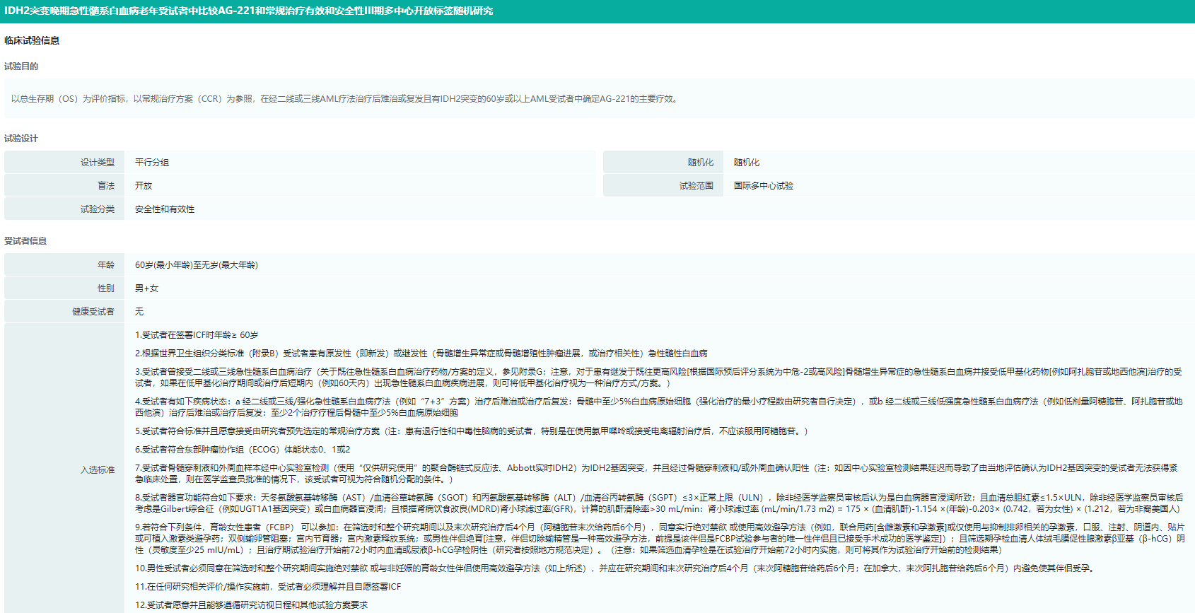 据药融云全球药物研发数据库显示,Enasidenib于2017年8月在美国获批用于AML,随后在加拿大和澳大利亚上市,是首个上市的突变IDH2抑制剂,其可以导致催化活性受损。尽管该药目前在国内处于三期临床状态(登记号:CTR20170961,最高研发阶段的适应症为AML),但该药已被列入对有IDH2突变AML患者治疗的一级推荐药物清单。除AML外,骨髓增生异常综合征也为Enasidenib另一个在研的适应症,全球最高研发阶段达到了三期临床。