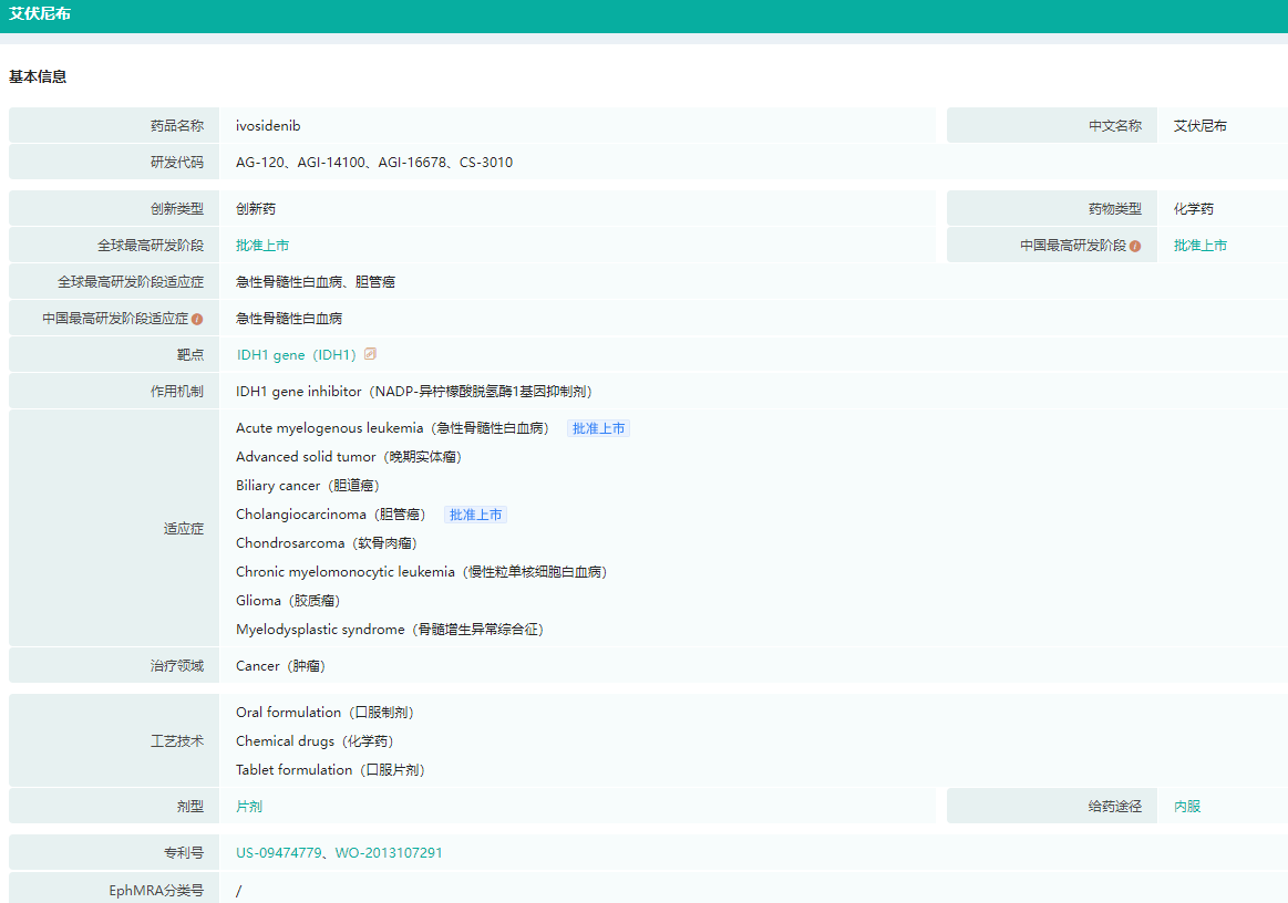 虽然该药目前仅在美国获批上市,但在全球多地开启了适应症为AML、胆管癌、肝胆系统肿瘤、骨髓增生异常综合征、胶质母细胞瘤、软骨肉瘤、晚期实体瘤等的临床研究,大多处于二期临床阶段。