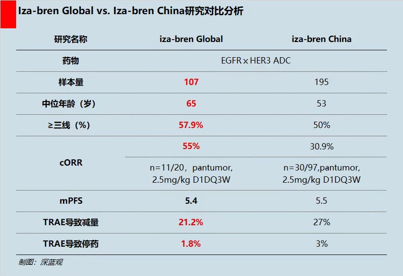 与国内早期研究相比,Iza-bren Global研究的中位年龄为65岁,显著高于中国的53.5岁;更重要的是,全球研究中,接受过三线及以上治疗的患者比例高达57.9%,高于中国的50%。