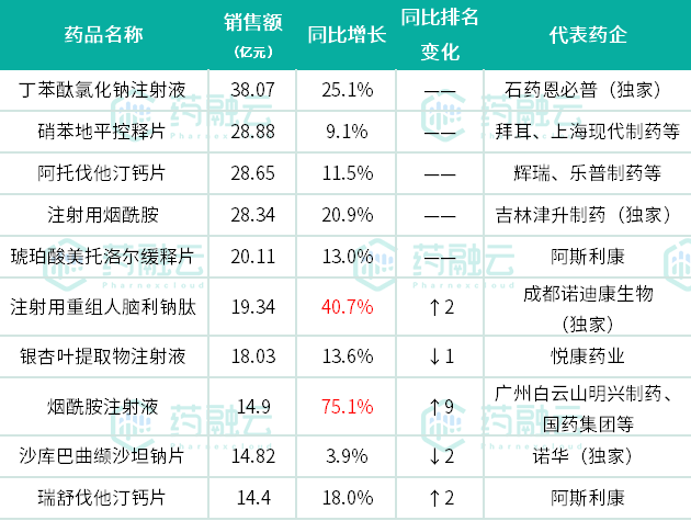 其中,前10品种均保持着良好的增长趋势,最高达75.1%,为最新上榜的烟酰胺注射液;其次,成都诺迪康生物的独家品种注射用重组人脑利钠肽也达到了40.7%高增长率。此外,石药集团恩必普药业的独家品种丁苯酞氯化钠注射液和吉林津升制药的独家品种注射用烟酰胺增长率均在15%以上。
